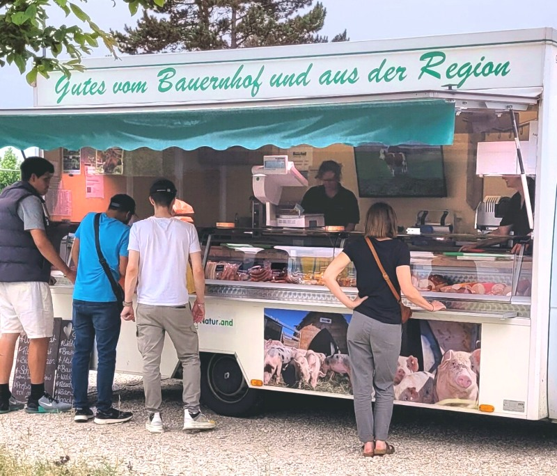 Mit viel Engagement vermarktet der Biobauer alle Erzeugnisse selbst. Die beiden Metzgereiwägen sind beliebte Anlaufstellen auf vielen Wochenmärkten in und um Regensburg.