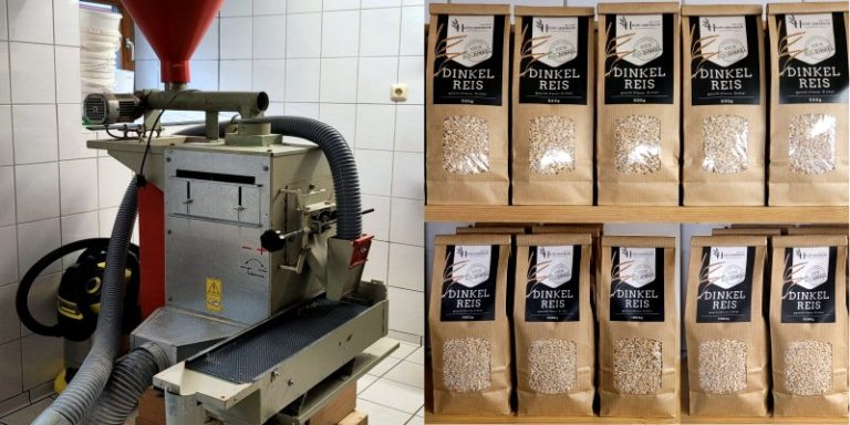 Das schöne Projekt „Dinkelreis“ startete mit der Entdeckung, dass sich die 20 Jahre alte und längst nicht mehr benutzte Dinkelschälmaschine nicht nur zum Entspelzen, sondern auch zum Schleifen der Körner eignete. Und der so gewonnene Dinkelreis schmeckte nicht nur der Familie, sondern Bekannten und Freunden so gut, dass sie es nicht dabei belassen wollten: Der Einstieg in die Direktvermarktung war gefunden.