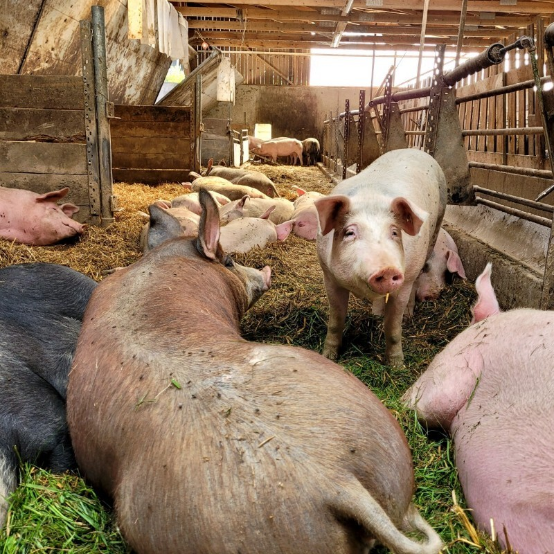 Ruth und Franz Graf starteten 2001 mit bescheidenen 6 Schafen, 3 Ziegen und einer Kuh. Sie entwickelten daraus einen bemerkenswerten Biohof mit geschlossenem Betriebskreislauf . Die Einzellage mit großzügigem Umland ermöglicht eine Tierhaltung, wie sie besser nicht sein könnte. Luftige Tiefstreuställe, ein ständiger Weidezugang auch für die Schweine und jeder wirtschaftlichen Optimierung Hohn sprechende Mutter-Kind-Regelungen führen zu einer ungewöhnlich harmonischen Atmosphäre.