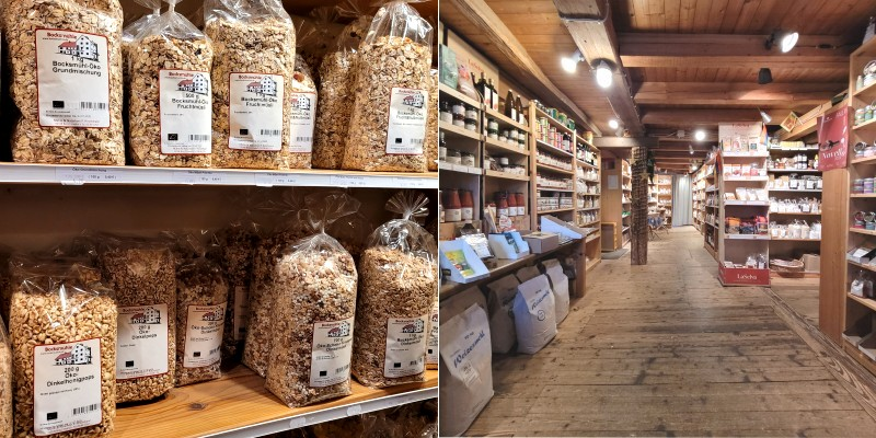 Er legt großen Wert auf Rohstoffe aus der heimischen Erzeugung, so von der Poschenrieder Mühle und der Gailertsreuther Mühle. Auch bei den zahlreichen anderen Spezialitäten wird auf einen kontrollierten ökologischen Hintergrund geachtet. Das umfangreiche Sortiment der Bocksmühle lässt keine Wünsche offen, und die Beratung ist sowohl freundlich als auch hochkompetent.
