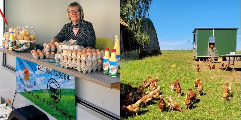 Martina kümmert sich um die Legehennen, denen zwei kompakte Mobilställen und großzügige Grünflächen zur Verfügung stehen.