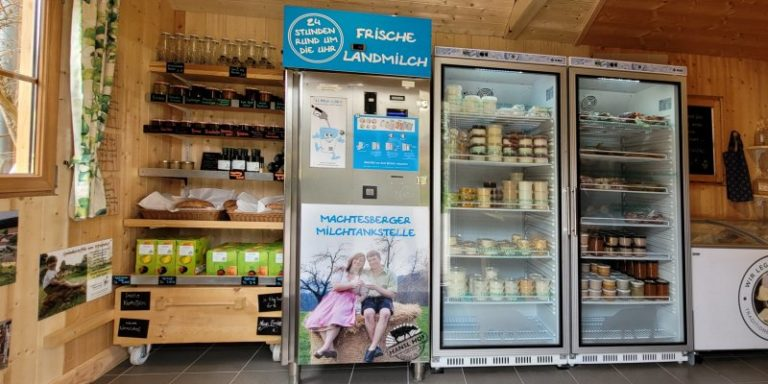 Verkauft wird im Hofladen, in dem sich auch eine Milchtankstelle befindet. Auch Lebensmittel mehrerer regionaler Produzenten werden angeboten.