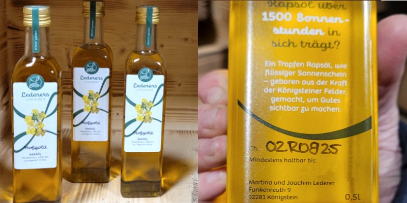 Zum Sortiment gehören Rapsöl und Leinöl vom eigenen Feld, schonend kaltgepresst und ungefiltert, sowie Mehle aus Weizen, Roggen und Dinkel, sowie Hartweizengries.