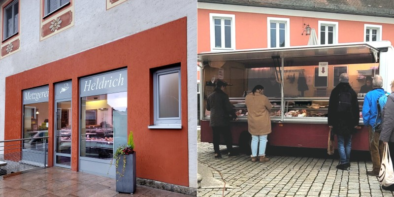 Wer in der kleinen Gemeinde Edelsfeld auf einen attraktiven Metzgerladen stößt, der dann auch noch ein beachtliches Sortiment bester Qualität bereit hält, darf sich glücklich schätzen. Mario Heldrich führt in 3. Generation den Familienbetrieb. Dieser ist regional bestens vernetzt und bezieht alle Schlachttiere aus der Gegend.