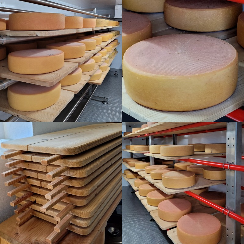 Am nächsten Tag bringt er den jungen Käse in den Reiferaum und lagert ihn auf eigens entwickelten Brettern. Mindestens drei Monate lang wendet er die Laibe alle zwei Tage.