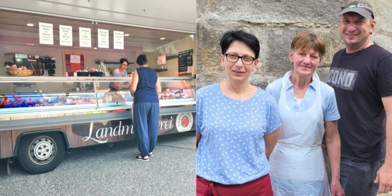 Hildegard Schneider, Tochter Heidi und Sohn Markus züchten seit Jahrzehnten Rotes Höhenvieh, schlachten und verarbeiten dieses in ihrer Landmetzgerei und vermarkten es auf mehreren Oberpfälzer Wochenmärkten.