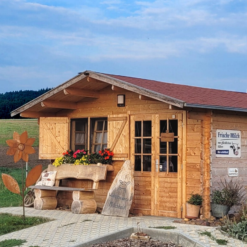 Markus und Sophie Donhauser bieten im liebevoll gestalteten Verkaufshäusl wohlschmeckende Bio-Rohmilch an, die eine steigende Zahl überzeugter Liebhaber anzieht. Kartoffeln, Eier und Honig ergänzen das Angebot.